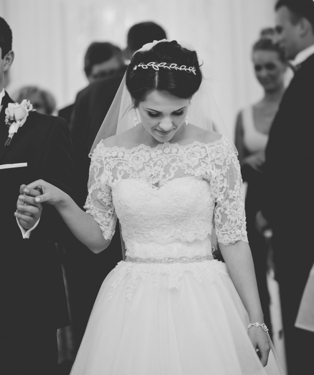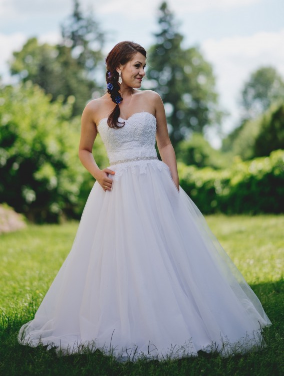 Jest to piękna klasyczna suknia ślubna z wiązanym gorsetem i tiulową spódnicą na niewielkim kole - zdecydowałam się na koło tylko po to, żeby łatwiej się poruszać.