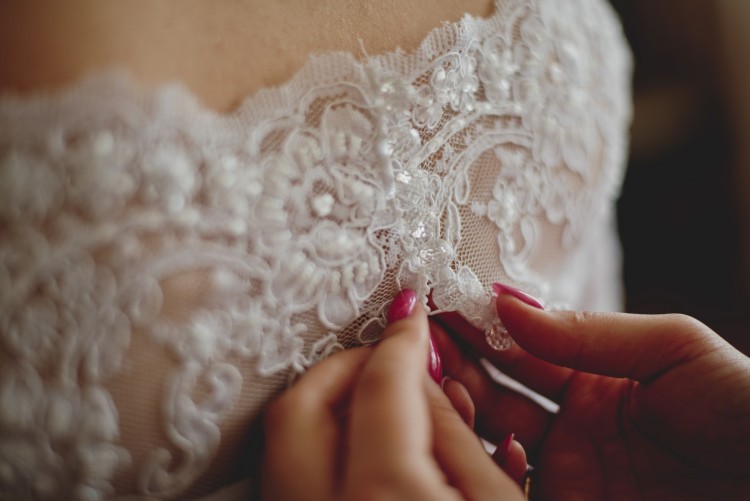 Na gorsecie jest śliczna zdobiona perełkami i koralikami koronka, która delikatnie połyskuje w słońcu i świetle. Do sukni dołączone jest bolerko, które jest wykonane z tej samej koronki, która znajduje się na gorsecie, dzięki czemu całość jest spójna. W talii doszyto błyszczący pasek.