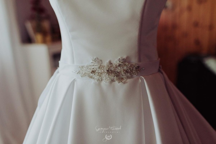 Atłasowa, biała suknia z odpinanym trenem. Delikatne zdobienia i kieszenie. Cena do negocjacji.