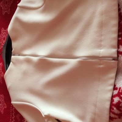 Góra delikatnie "pudełkowa", dół rozkloszowany, złota blaszka na bluzce, którą można odpruć.