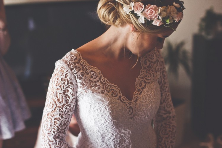 Suknia z długim rękawem uszyta jest z wysokiej jakości materiałów. Góra - z grubszej koronki/ gipiury - (nie krępuje ruchów, jest solidna dlatego też nie została naruszona, rozdarta itp.)