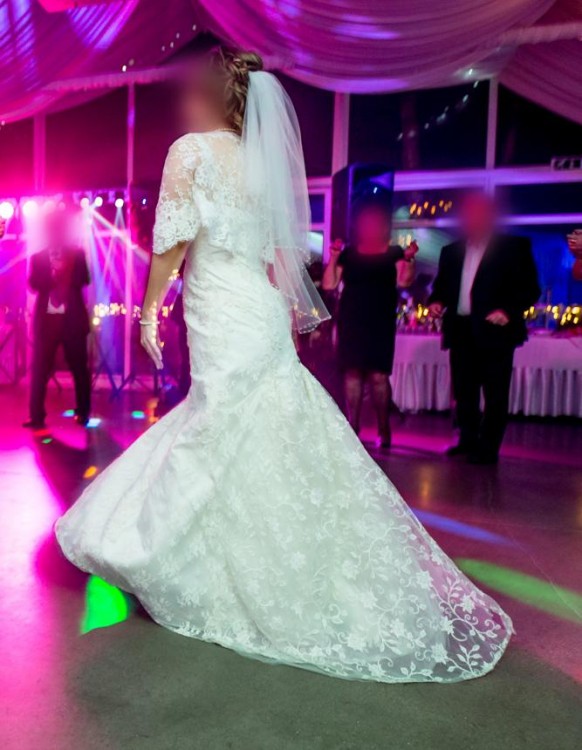 Nie mieliśmy sesji plenerowej, więc suknię miałam na sobie wyłącznie w dniu ślubu i na krótkim weselu. Została wyprana w profesjonalnej pracowni Vimen Art, specjalizującej się w tego typu zabiegach. Jest w bardzo dobrym stanie. Zachęcam do przymiarki w Ząbkach lub w okolicach Galerii Mokotów.