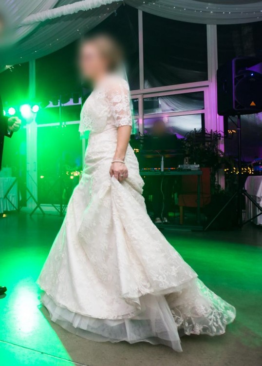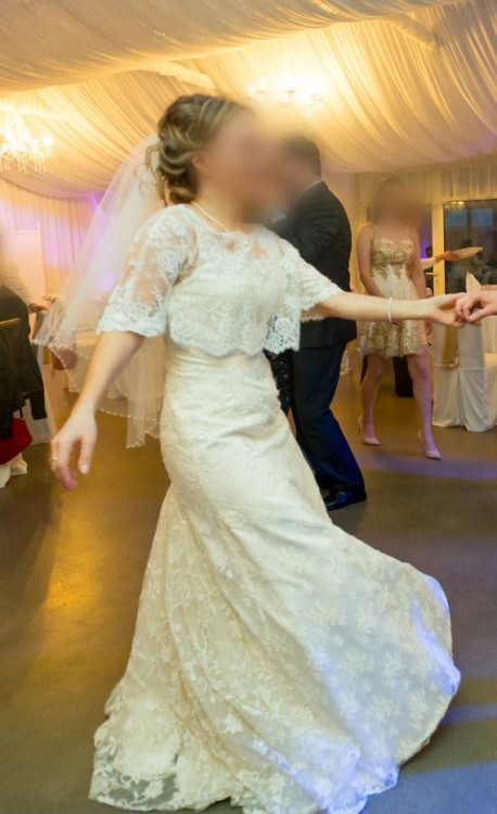 Suknia została wykonana bardzo precyzyjnie, z dbałością o każdy szczegół. Jest zdobiona ręcznie przyszywanymi koralikami oraz koronką na całej długości. Podkreśla atuty kobiecej sylwetki. Ma piękną złotą „poświatę” i miejscami połyskujące detale. Wierzchnia warstwa jest cała z koronki, z przodu ozdobiona aplikacją z cekinów i kamieni. Suknia ma bardzo wykwintny tren, podpinany na trzy guziczki. Jest wygodna i świetna w tańcu, nie krępuje ruchów. Suknia prezentuje się przepięknie. Ze względu na ślub w kwietniu miałam na sobie specjalnie szyte bolerko - mogę dołączyć je gratis!