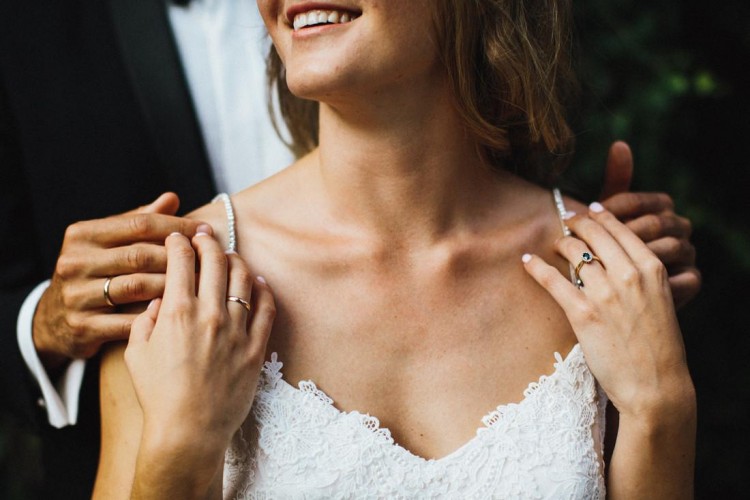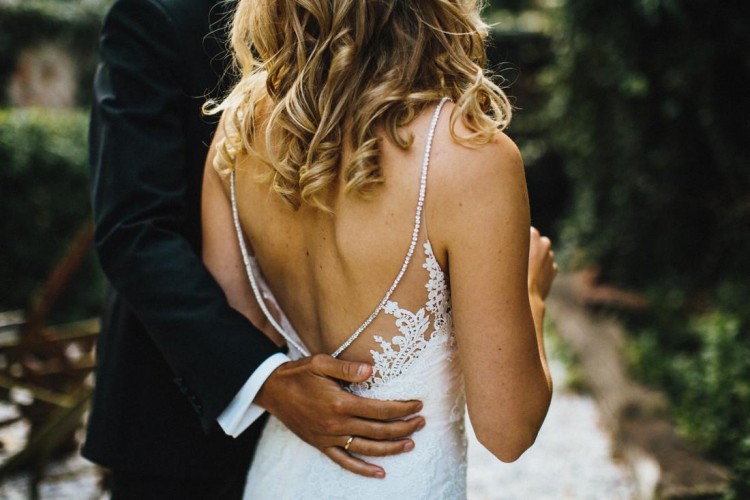 Tył ze w cięciem w kształcie litery V, ozdobiony koronką oraz delikatnymi kryształkami, zapięcie na kilka kryształowych guziczków.
