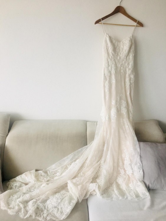 Suknia została wykonana bardzo starannie z materiałów najwyższej jakości: francuska koronka oraz tiul tworzące kilka warstw. Ręcznie naszywana piękna, romantyczna koronka.