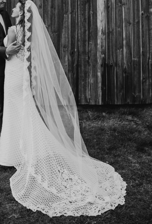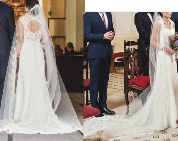 Suknia wykonana jest z koronki-gipiury, ozdobiona dodatkowo mieniącymi się elementami na biuście, w dolnej części sukienki oraz na trenie. Dzięki bardzo długiemu dopinanemu trenowi, sukienka ma dwa oblicza: bardzo romantycznej wersji do kościoła oraz wersji a’ la syrenki podczas wesela. Całość dopełnia welon, którego końcówki również są delikatnie haftowane.