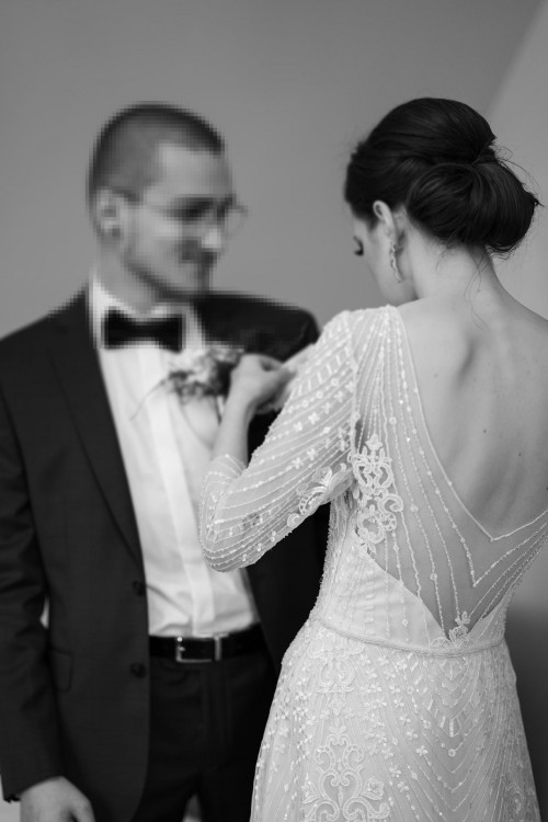 Suknia ślubna w kształcie litery A w stylu rustykalnym, boho. Prosta, uszyta w całości z włoskiej geometrycznej koronki (haft na tiulu). Ciężko znaleźć suknię w całości z koronki z tego powodu, że jest bardzo droga, tutaj użyte jest ponad 5m materiału. Na całości koronki połyskujące cekiny ( piękny efekt w ruchu) Dekolt v, rękawy 3/4 z tyłu głęboko wycięte plecy. Suknia ma bardzo prosty krój jednak jest bardzo efektowna. Uszyta w małej manufakturze według własnego projektu, nie kopia z pinteresta, jedyna taka. Cała góra sukni pieczołowicie wyszywana ręcznie koralikami, w tali pas z koralików, też robiony ręcznie. Zapinana z boku na suwak. Piękny koronkowy, bardzo efektowny tren, który można póżniej podpiąć. Kolor sukni koronka - kolor śmietanowy, podszewka w kolorze śnieżniej bieli by podkreślić koronkę.