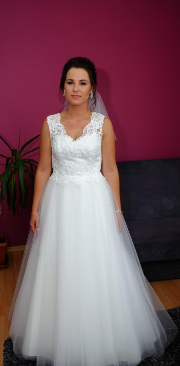 Sprzedam przepiękną suknię ślubną w literkę A/delikatna Princess. Góra sukni wykonana jest z koronki, wyszywana ręcznie koralikami, które pięknie się mienią. Suknia zapinana jest na zamek, dzięki czemu jest bardzo wygodna. Założenie trwa dwie minuty. Jest bardzo lekka i wygodna. W gorsecie wszyte są miseczki, które bardzo dobrze podtrzymują biust ( nie ma potrzeby zakładania biustonosza). Dół sukni składa się z kilku warstw tiulu.