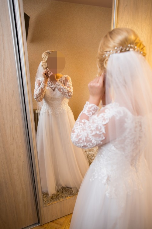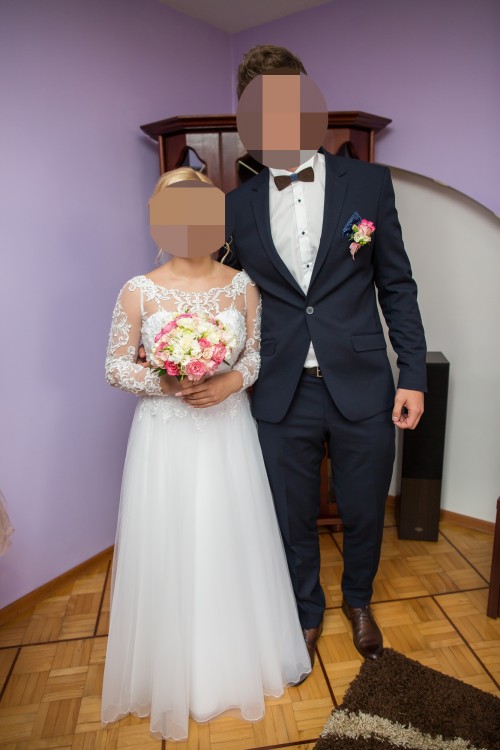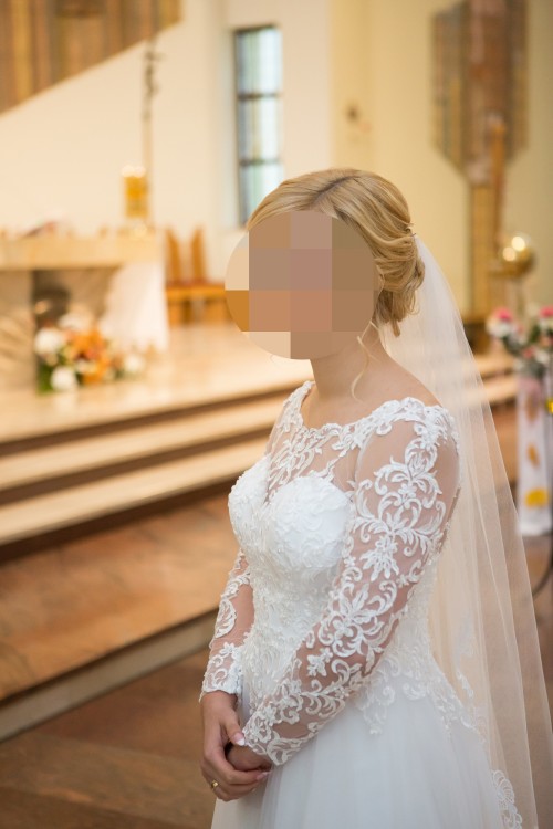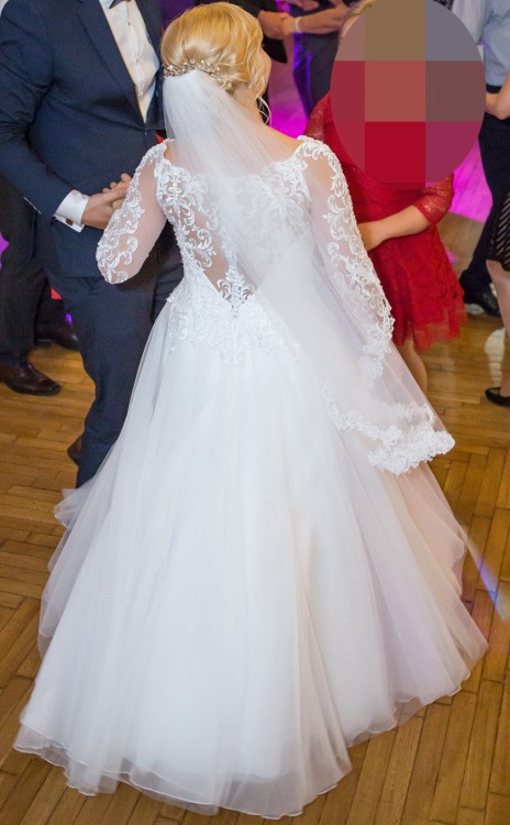 Suknia została założona tylko raz na ślubie oraz raz na plenerze ślubnym, nie jest zniszczona. Dodatkowo mogę zaoferować welon za 150 zł pasujący do sukni.
