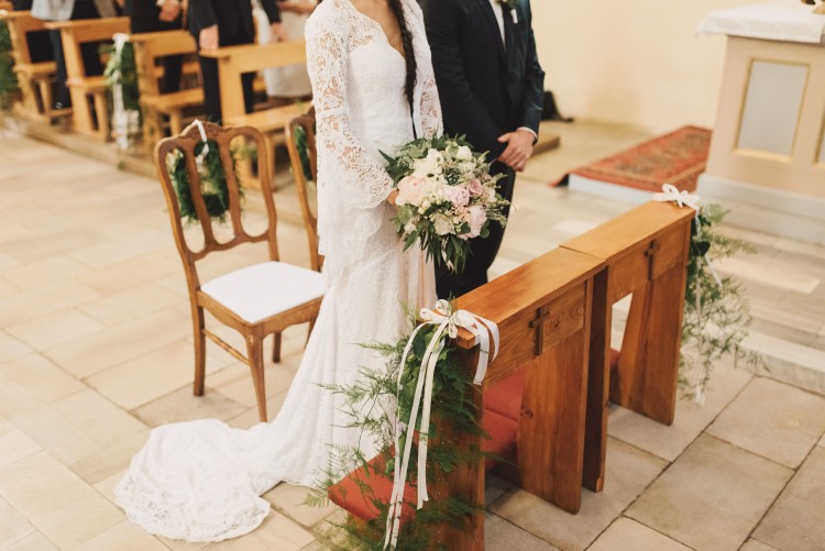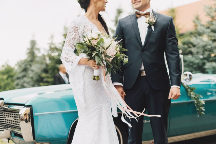 Koronkowa suknia ślubna z trenem od znanej, wrocławskiej projektantki Małgorzaty Motas.