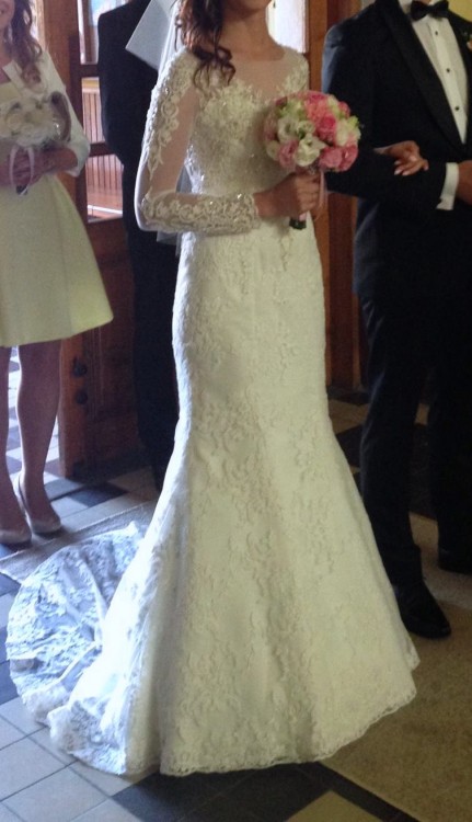 Sprzedam suknie ślubną Firmy MS Moda, model Eleanor kolekcja 2016 (ja poprosiłam o doszycie długich rękawów). Koronkowa suknia z podpinanym trenem w kolorze śmietankowym, w części gorsetu i na rękawach zdobiona kryształkami dającymi niesamowity efekt. Rozmiar 36/38, wzrost 172cm + obcas 6 cm. Biust 90-92/ talia 66-70/ biodra 92. Ma przepiękne plecy. Suknia była wyczyszczona w pralni chemicznej. Za suknie zapłaciłam 3500 zł. Zapraszam serdecznie!