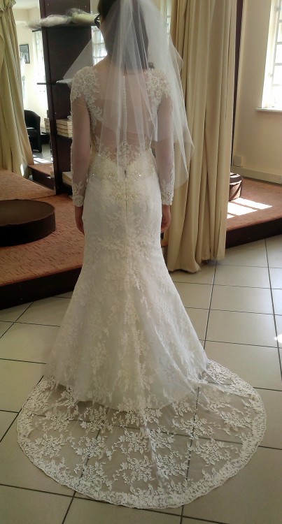 Koronkowa suknia z podpinanym trenem w kolorze śmietankowym w rozmiarze 36/38, wzrost 172cm + obcas 6cm.Biust 92/talia 68/biodra92