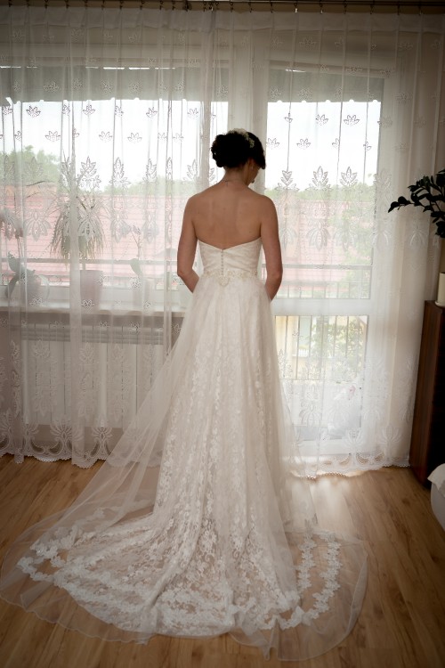 Śliczna, romantyczna suknia ślubna z podpinanym trenem.