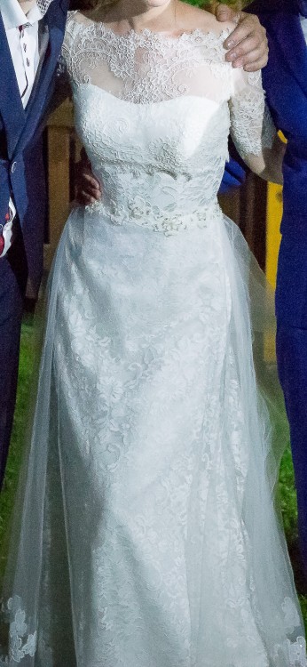 Suknia doskonale prezentuje się z koronkowym bolerkiem (nie jest dołączone)