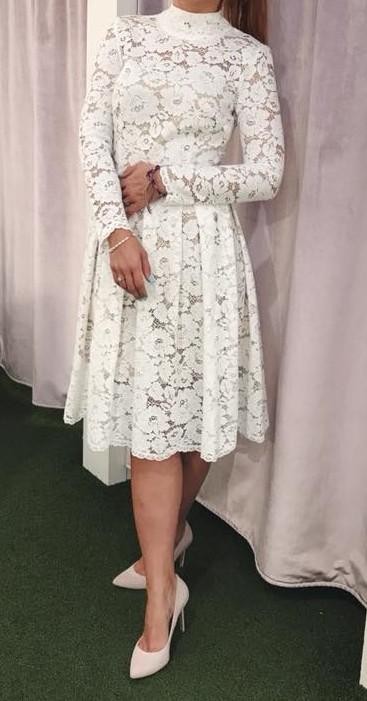 Krótka, koronkowa suknia ślubna ze stójką na długi rękaw, idealna na ślub cywilny ale nie tylko, do wykorzystania i na inne okazję. Przy wzroście 175 cm sięga za lekko za kolano.
