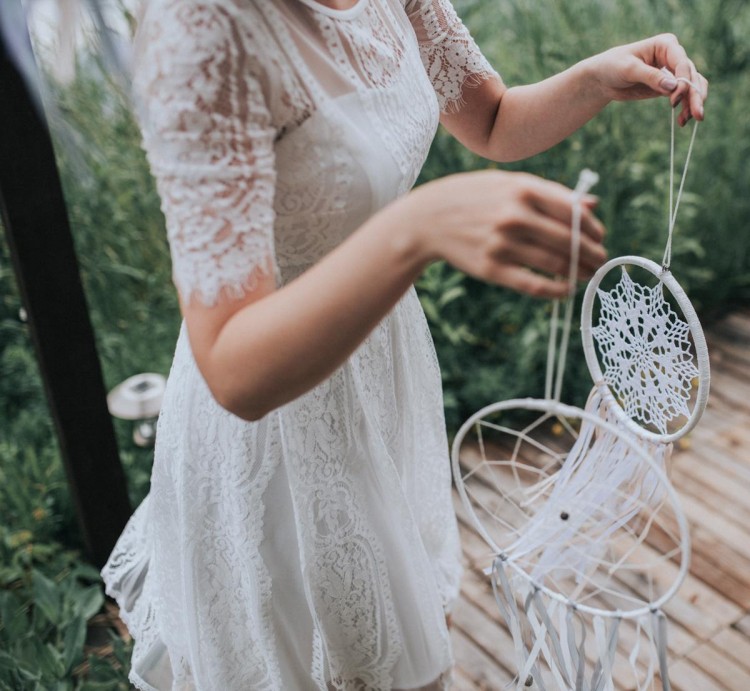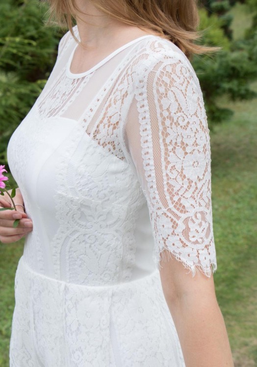 Niezwykła krótka sukienka ślubna lub na poprawiny. Najbardziej pasuje do stylu boho, rustykalnego, idealna na ślub plenerowy.