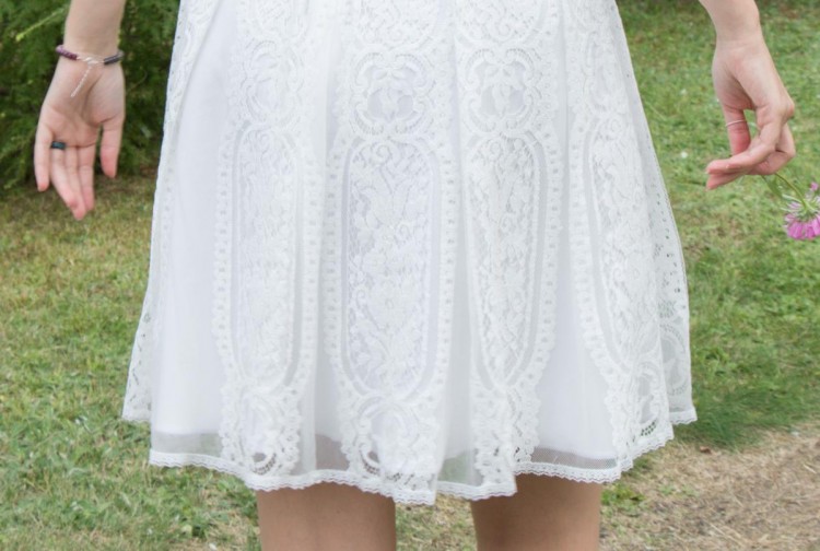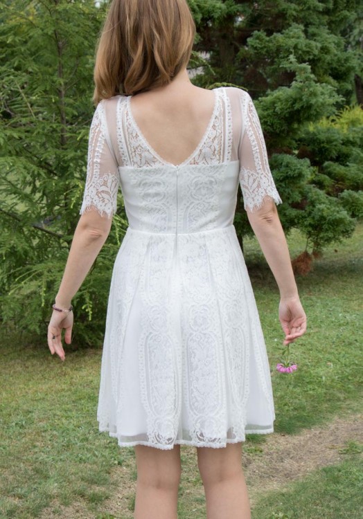 Niezwykła krótka sukienka ślubna lub na poprawiny. Najbardziej pasuje do stylu boho, rustykalnego, idealna na ślub plenerowy. Bardzo lekka i wygodna, materiał przyjemny, nie chce się jej zdejmować :)