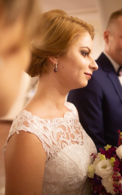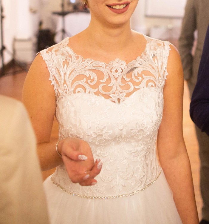 długość za kolano, odcięcie w talii. dół uszyty z kilku warstw materiału, przez co cudownie się układa. komfortowa w noszeniu, nie czuć tak bardzo jej ciężaru. wycięcie na plecach sięga linii talii. z tyłu zapinana na suwak (do linii talii), haftkę w talii oraz guziczki do samej góry. suknia w stanie idealnym, nie posiada żadnych uszkodzeń, rozerwań. nie była czyszczona, posiada lekkie zabrudzenia pod pachami. warstwy tiulu oraz koronka idealnie czyste. więcej zdjęć mogę wysłać mailem.