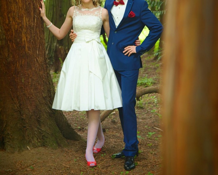 Krótka suknia ślubna z koronką ręcznie wyszywaną.