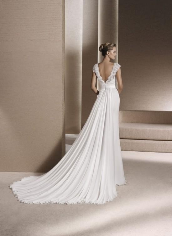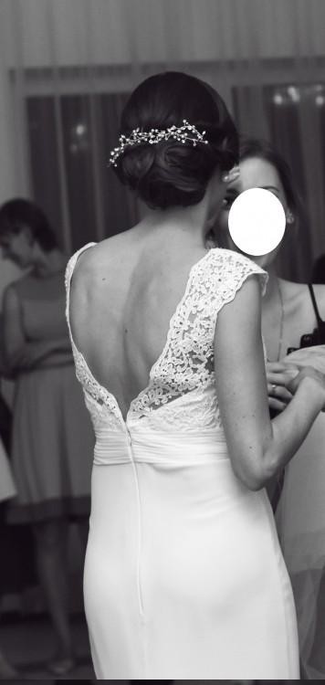 mam do sprzedania suknie ślubną z grupy Pronovias, kolekcja La Sposa, Jest to bardzo elegancka suknia dopasowana do figury, góra sukni z hiszpańskiej, bawełnianej koronki, talię podkreśla drapowany pas, dół sukni z warstwy muślinu. Suknia jest lekka i bardzo wygodna.