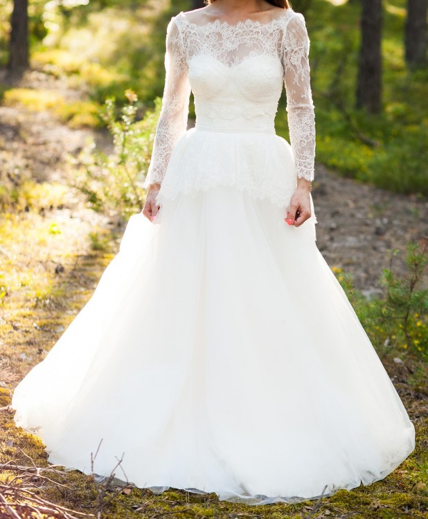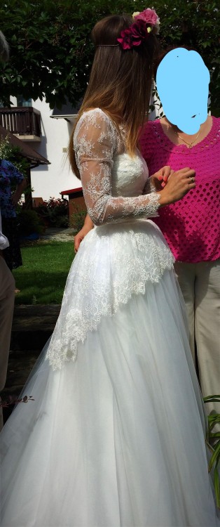 Suknia Ślubna w idealnym stanie. Dla osoby w rozmiarze 34 oraz 36 gdyż ma sznurowanie z tyłu. Bardzo wygodna- uszyta dla osoby która uwielbia dobrą zabawę i komfort :) Góra uszyta w stylu gorsetu bieliżnianego z podkreślonym biustem. Koronka jest bardzo delikatna i subtelna. Sprzedaję w komplecie bolerko krótkie które ma długi rękaw. Swietny sposób aby w jedną chwilę odmienic swoją suknię podczas wieczoru. Bolerko zapinane jest na delikatne guziki. Dól sukni uszyty jest z delikatnego tiulu. Kolor to śmietanka. Możliwość przymiarki sukni także w Warszawie. Baskinka oddziela bogatą górę od subtelnego dołu. Bardzo bardzo wygodna suknia- polecam.