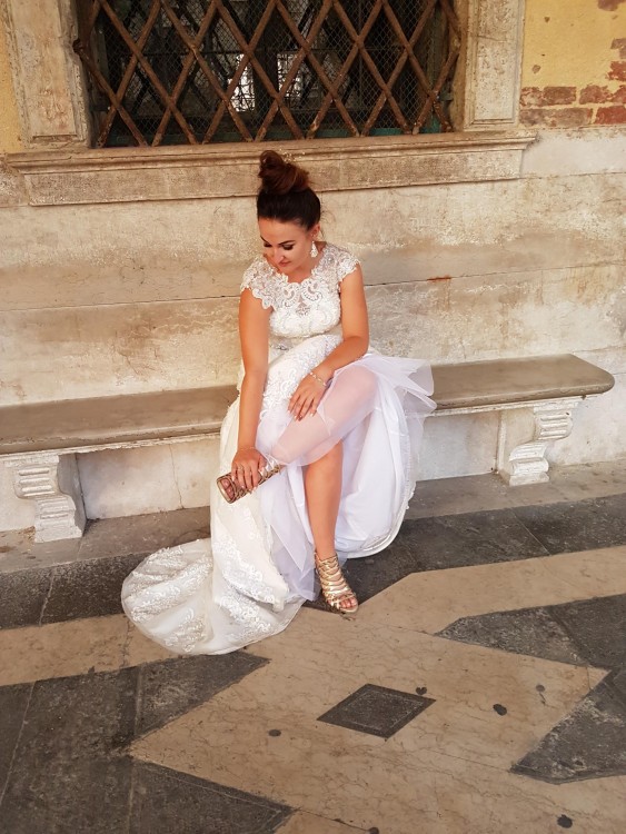 Suknia sprawia wrażenie ciężkiej, dlatego jest idealna dla odważnych, pewnych siebie kobiet. Idealna na wysokość 169 cm wzrostu + 10 cm obcas. Nie ma jednak żadnych przeciwwskazań do skracania lub zwężania. Mam również kolczyki idealnie odwzorowujące motyw na sukni-DORZUCAM GRATIS!