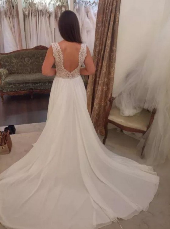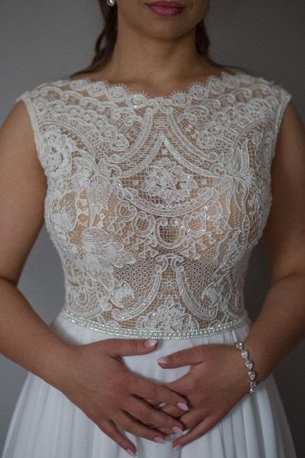 Suknia ma wycięte plecy w literę V, bez żadnej siateczki, pomimo tego świetnie się trzyma i się nie marszczy. Koronka jest ręcznie wyszyta delikatnymi koralikami, na oryginalnej koronce która naszyta jest na cielistej siateczce. Wokół talii jest pasek z delikatnych perełek. Suknia posiada podpinany tren.