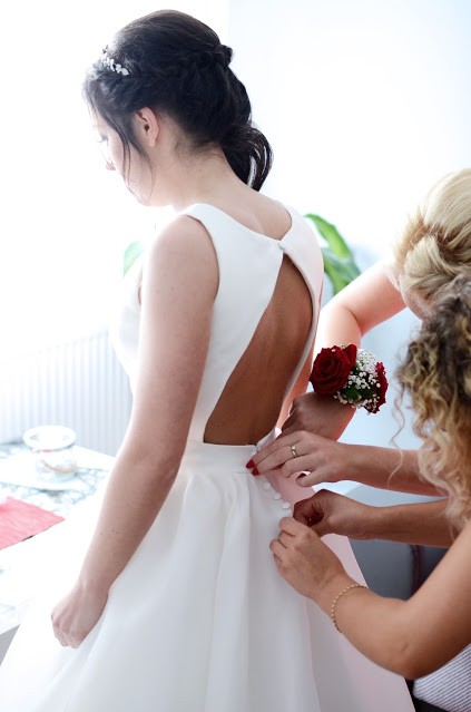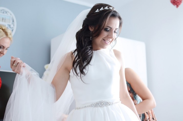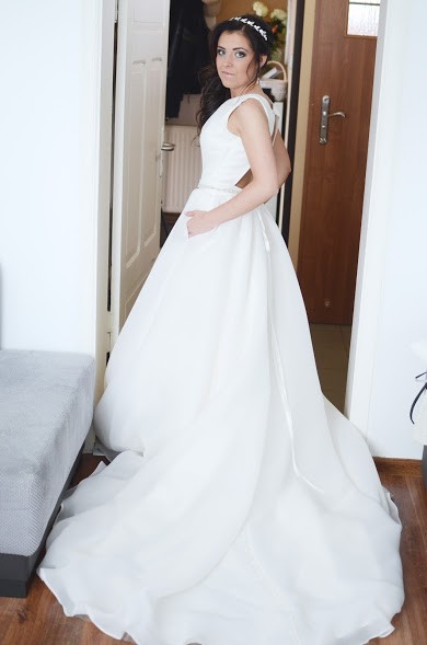 Suknia posiada dwie kieszenie. Pięknie zdobiony pasek z kryształów Swarovsiego dodaję sukni blasku. Wycięcie na plecach najbardziej zachwyca! Długi tren do którego trzeba doszyć sznurki aby móc tren podpiąć. Do sukni dołączę dwa welony z kryształkami Swarovskiego oraz opaskę na głowę.