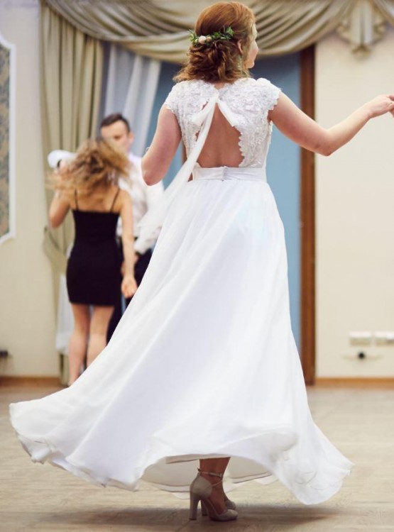 Sukienka jest bardzo wygodna, w stanie idealnym. Bardzo ładnie układa się w tańcu.