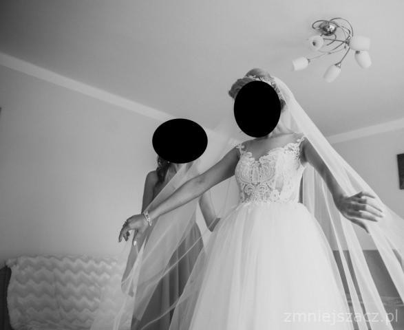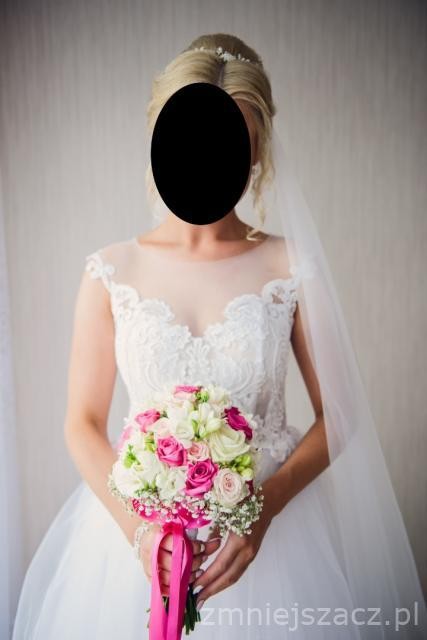 Suknia jest bardzo wygodna i ślicznie się prezentuje. Zachwyciła gości weselnych :)Do sukni dodaję oczywiście pokrowiec oraz dwa welony (długi, który miałam do ślubu i krótki na wesele) oraz etole z tiulu .Posiadam rowniez ozdobe do włosów którą również mogę sprzedać przepieknie mieni się na włosach. Wrazie pytań zapraszam do kontaktu .