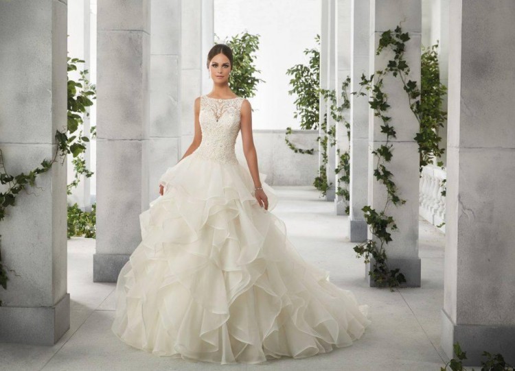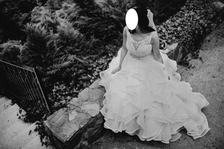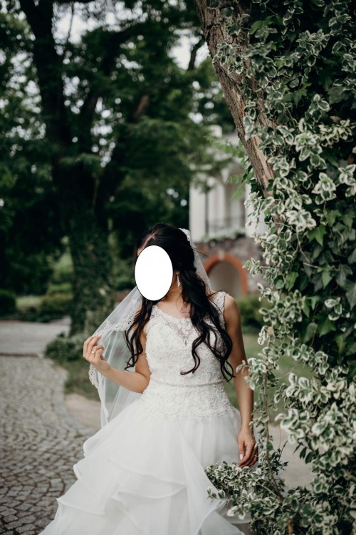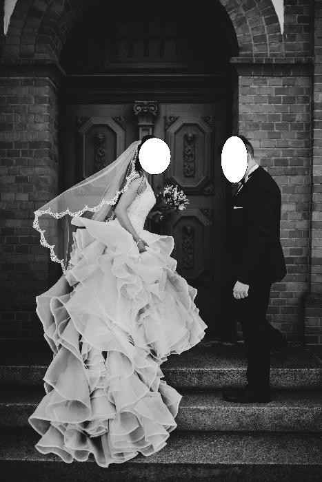 Sprzedam piękną suknię Mori Lee 51204. Suknia wykonana z wielką starannością. Wysoki, koronkowy dekolt, wyszywany kryształkami na iluzorycznym materiale. Balowa falbaniasta spódnica z organzy. Przepiękny tren, który bardzo łatwo i szybko się podpina, podpięty tren jest schwoany w falbanach i niewidoczny. Głębokie wycięcie na plecach. Spódnica na kole (w zestawie). Możliwość wszycia stanika, co jest bardzo wygodne. Polecam! Czułam się w tej sukni wyjątkowo, szkoda, żeby wisiała w szafie :) Zmiany krawieckie dokonane w sukni - delikatnie powiększony dekolt, wszyty wąski pasek w talii.