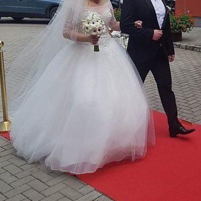 Sprzedam piękną tiulową suknię ślubną w kolorze: Ivory, znanej firmy Mori Lee - model 5216, kolekcja: by Madeline Gardner. Sukienka na zdjęciach jest przedstawiona na osobie w rozmiarze: 42, rozmiar z metki to:16. Dzięki regulacji za pomocą wiązania będzie pasowała również na osobę noszącą mniejszy lub większy rozmiar. Długość sukienki została dopasowana do osoby o wzroście 170cm + około 10cm obcas. Gorset sukienki pokryty jest oryginalnymi kamieniami Svarowskiego oraz perełkami. Przepięknie mieni się w słońcu jak i w sztucznym świetle. Fason sukni to typowa princessa. Dolna część składa się z 9 warstw. Nie ma potrzeby ubierania dodatkowych halek, gdyż sukienka sama w sobie jest bardzo rozłożysta. Sukienka ubrana była dwa razy - podczas ślubu i sesji fotograficznej. Stan sukni oceniam na bardzo dobry. Wymaga jedynie odświeżenia w pralni.