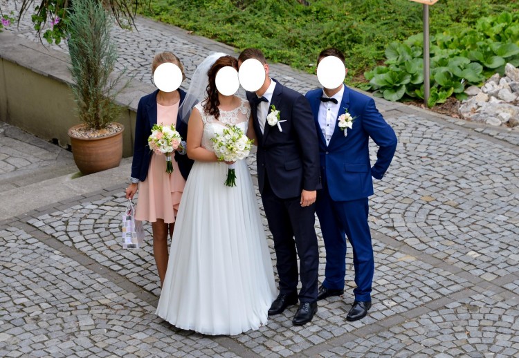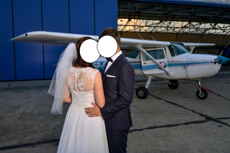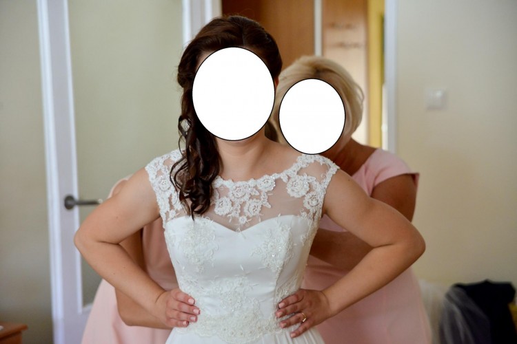 Suknia w kolorze ivory, góra wykonana z delikatnej koronki, dół z muślinu.