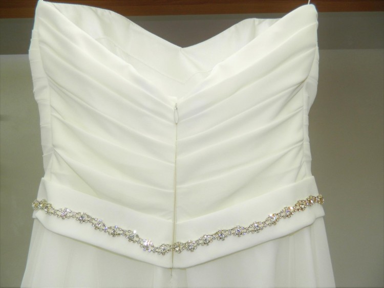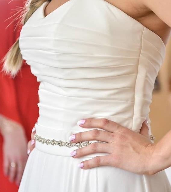 Suknia posiada połyskujący pasek, który można bez problemu odpruć i zamontować inny.