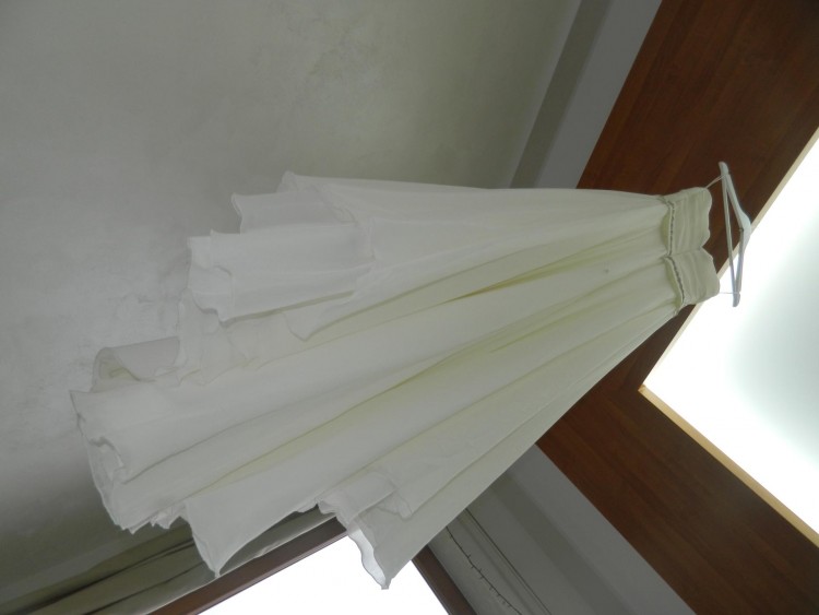 Rozmiar sukni 36/38 - zapinana na suwak i wewnątrz wiązana (zapięcie widoczne na zdjęciu). Wzrost 166cm + 9cm szpilka. Wykonana z muślinu więc jest lekka i zwiewna. Nie posiadam koła, gdyż go na sobie nie miałam w dniu ślubu i na weselu (wystarczająca ilość tiulu pod spodem).