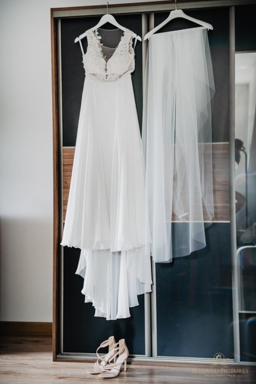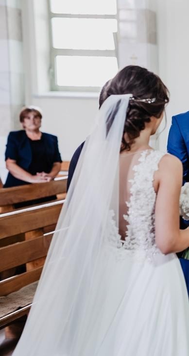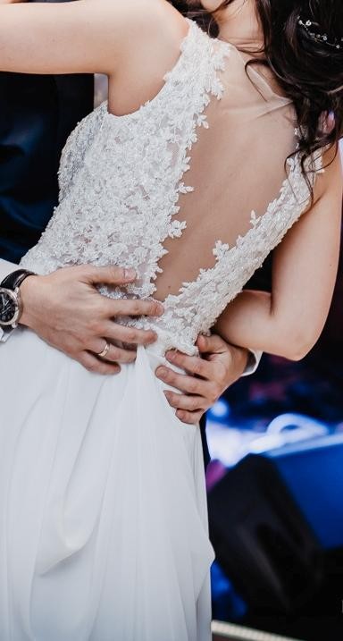 Sprzedam suknię ślubną - koronkowa góra ze zdobieniami, wbudowane miseczki. Suknia posiada podpinany tren, kolor śmietankowy, dól sukni muślinowy- pięknie prezentuje się w tańcu. Suknia bardzo wygodna. Rozmiar 36, szyta na wzrost 166 +10 cm Cena 2200 zł z welonem 3m
