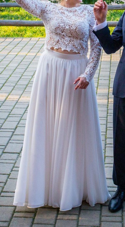 Mam do sprzedania spódnicę ślubną Ecco zakupioną w Salonie "Mendelssohn" na ul.Długiej 12 w Krakowie dn. 12.09.2017. Suknia jest rozmiaru 36/38 ( mój wzrost: 160 cm) - koloru śmietankowego z satyny i podwójnej warstwy muślinu z trenem podpinanym na niewidoczne guziczki z tyłu. Spódnica ma wysokie rozcięcie na lewej nodze. Założona dwa razy ( ślub i sesja plenerowa). Myślę, że nie trzeba jej specjalnie reklamować bo zdjecia mówią same za same. Gdybym miała podjąć jeszcze raz decyzję o zakupie - chętnie wyszłabym jeszcze raz za mąż i znów ją kupiła:)