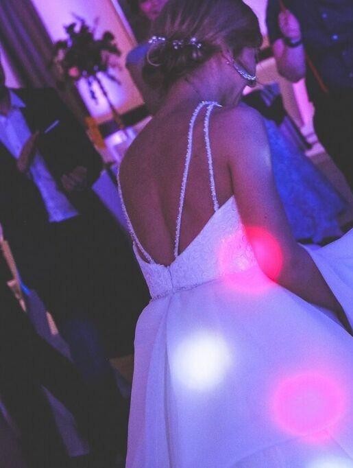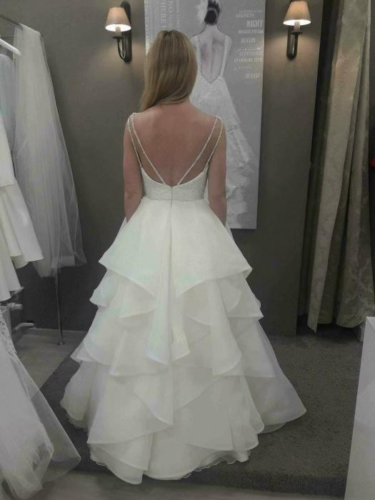 Kaskady na spódnicy, wszyte miseczki, gipiura pokryta cekinami dzięki czemu cudownie się błyszczy, pas w talii oraz ramiączka na plecach pokryte drobnymi kryształkami.