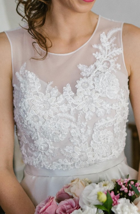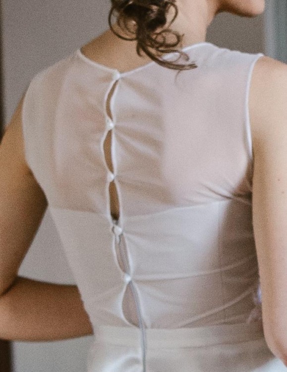 Na górę sukienki składa się tiul obszyty kwiecistym wzorem, ozdobiony koralikami, zapinany na plecach na 5 perłowych guziczków; oraz cielisty gorset dopasowany do ciała, zapinany niewidocznym zamkiem.