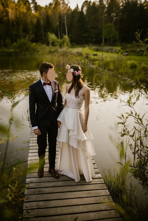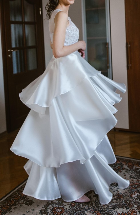 Suknia składa się z dwóch części: gorsetowa sukienka z asymetrycznym dołem oraz długa spódnica. Dzięki takiemu rozwiązaniu w trakcie przyjęcia weselnego możesz zadziwić gości dwukrotnie swoją kreacją - podczas uroczystości zaślubin ubrana w delikatną, romantyczną długą wersję (sukienka + spódnica), a na czas zabawy weselnej zaskoczyć szałową "nową kreacją" po zdjęciu spódnicy.