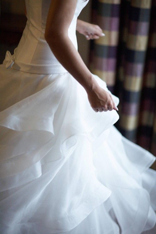 Suknia jest wykonana w całości z jedwabiu. Jej unikatowość polega na tym, iż właściwie jedyną ozdobą sukni są fantazyjne falbany, które układają się w niesamowity sposób tworząc wyjątkowy i niespotykany wizerunek panny młodej.