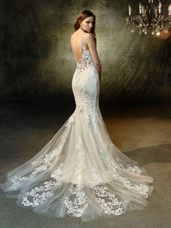 Pięknie podkreślająca kształty rybka z koronkami na górze i na całej długości trenu. Ramiączka są w całości z błyszczących kryształków. Suknia zrobiła ogromne wrażenie na gościach, mimo kroju syrenki, jest miękka i wygodna - przetańczyłam w niej całą noc. Na trenie wszyte są guziczki do efektownego podpięcia trenu.