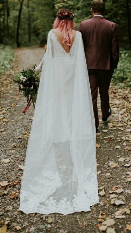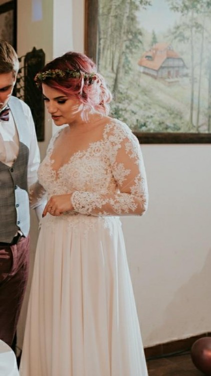 W komplecie jest piękny łańcuszek na plecy oraz długa peleryna wykończona ręcznie koronką z góry sukni, która doskonale zastępuje tren lub długi welon w czasie ceremonii i dodaje sukni wyjątkowości.