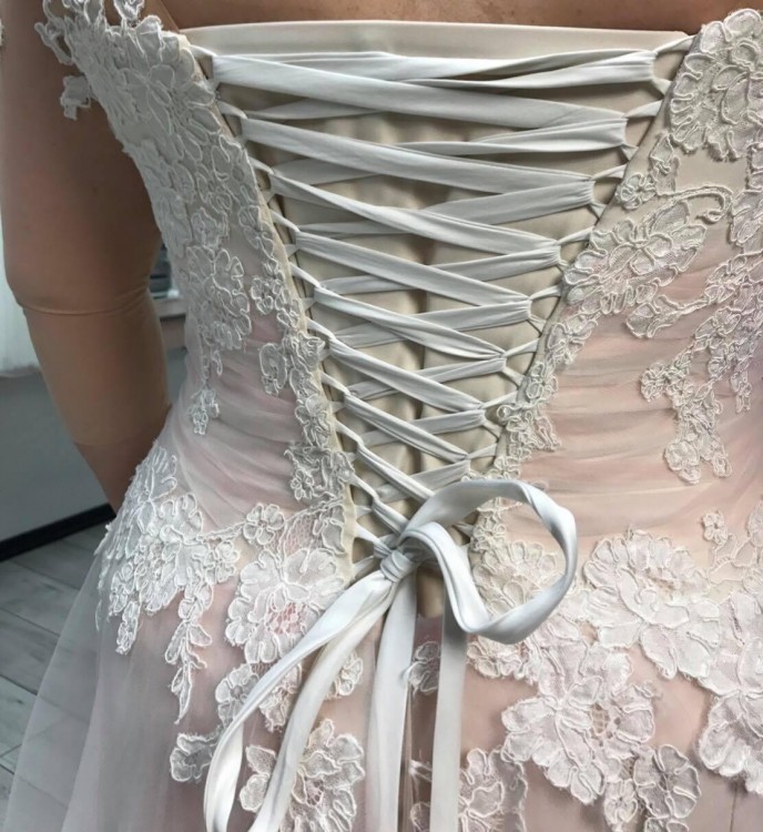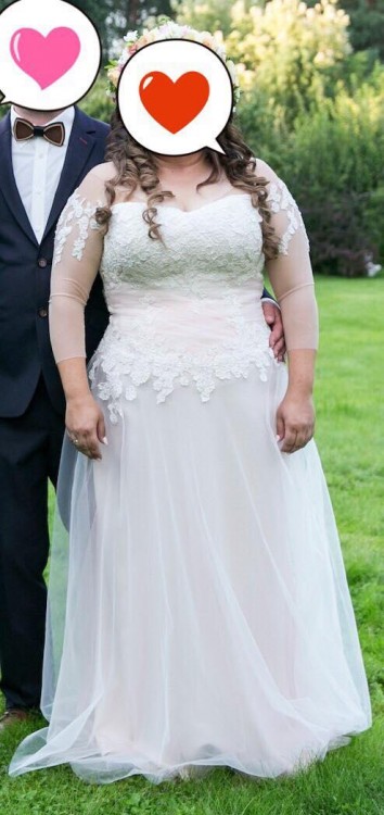 Na sprzedaż suknia ślubna z 2017 r. Suknia na wzrost 164 plus 8 cm obcas. Do sukni doszywane były rękawy. Suknię swobodnie można skrócić. Dół sukni złożony z trzech części: pierwsza beżowa, opinająca i podkreślająca figurę, na to różowy i biały tiul. Suknia będzie pasowała na rozmiar 46-50. W razie dodatkowych pytań proszę o kontakt.