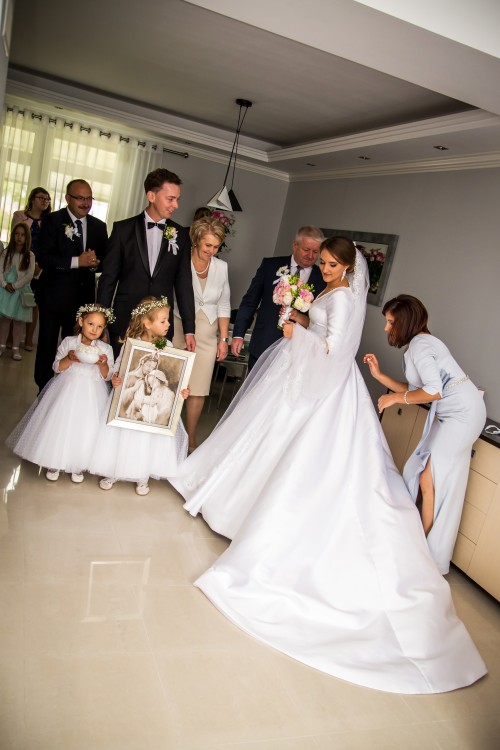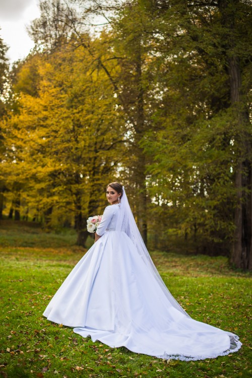 Jeśli szukasz niepowtarzalnej sukni ślubnej w stylu prawdziwej królowej to trafiłaś na dobre ogłoszenie! To suknia dla Panien Młodych którym znudziły się już tiule i koronki. Suknia to świetna opcja dla tych dziewczyn które chcą wyglądać elegancko i z klasą a nie koniecznie odpowiada im krój syreny. Wyjątkowa suknia ślubna uszyta na zamówienie według mojego projektu ze szlachetnego materiału mikado, który pięknie się układa i nie mnie się. Suknia posiada zdobienia na pasie i dopasowane do niego zdobienia na dekolcie i rękawach. Materiał niesamowicie dodaje szyku. Rozmiar 36/38 na wzrost 162+12 cm obcas. Suknia posiada halkę co nadaje jej objętości. Istnieje opcja niezakładania halki przez co suknia będzie mniej rozłożysta. Tył pleców ma wstawiony piękny haft który dodaje uroku sukni. Posiadam dwa welony długi( katedralny) i krótki który można założyć na wesele. Oba mają uroczą kokardkę co czynie je wyjątkowymi. Do sukni dodaje tren który można całkowicie odpiąć co jest istotne gdyż w żadnym salonie nie zaoferowano mi takiego rozwiązania a tren upinany na sukni dla mnie psuje efekt tej dostojnej kreacji( tren przypina się w pasie a następnie zasłania zapięcie ozdobnym pasem. Jest to po prostu dopinane"pół spódnicy" czego kompletnie nie widać bo tren "wchodzi" w fałdy sukni). Oferuje w cenie drobne poprawki u profesjonalnej krawcowej z wieloletnim doświadczeniem. Jest możliwość skrócenia sukni jak również zlikwidowania rękawów. Gdy ja kupowałam suknie całość wyniosła mnie 9000 zł ( za same welony które całe obszyte są piękną koronką zapłaciłam 2300zł)