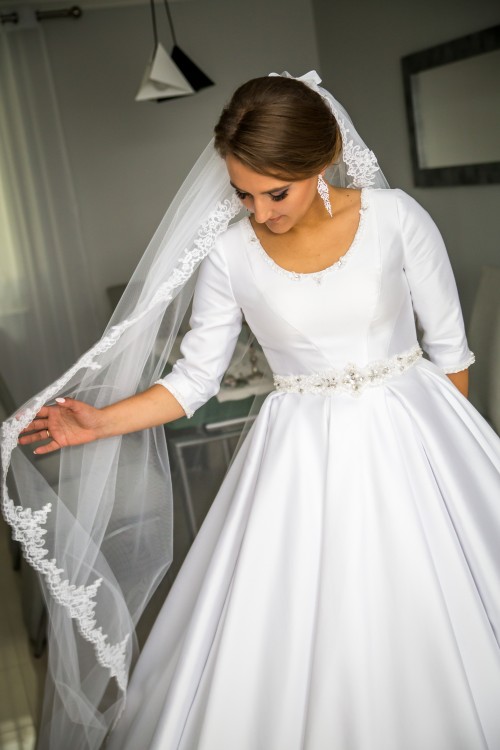 Suknia ślubna ze szlachetnego materiału MIKADO z dwoma welonami w kolorze śnieżnej bieli z pięknym pasem. Odpinany tren gratis.