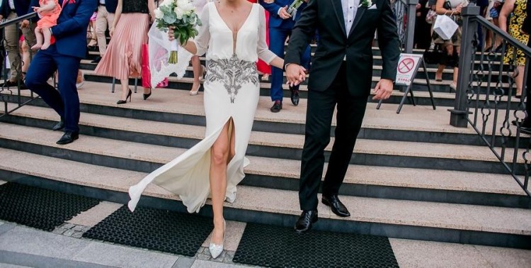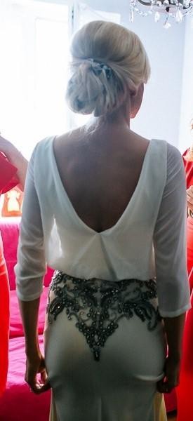 Suknia ma rozmiar 36/38 i jedyną przeróbką względem oryginału było zwężenie rękawów. Niewątpliwe wrażenie robi zdobiony pas jak i długi, podpinany tren. Suknia fantastycznie eksponuje dekolt, plecy i podkreśla kobiecą figurę. Jest prosta, ale jednocześnie piękna i strojna - nie potrzebuje dodatkowej biżuterii, zastępują efektowne koraliki na biodrach.