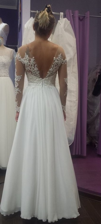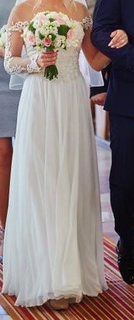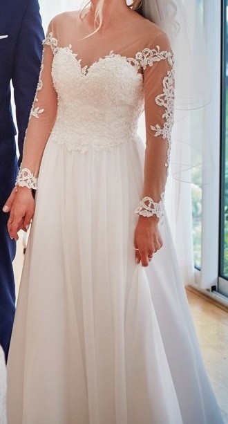 Sprzedam suknię ślubną szytą na miarę w Rzeszowie w sierpniu 2017. Suknia po pralni chemicznej, w kolorze śmietankowym i stanie bardzo dobrym! Szyta na wzrost 163 + ok. 9cm obcas, rozmiar 34/36. Suknia jest z cieniutkimi, długimi rękawkami z cielistej siateczki, na których została ułożona gipiura (niezwykle efektywna) na wzór opadającego ramiączka. Ta sama gipiura zdobi gorset wycięty z przodu w serce, a z tyłu w głęboki dekolt. Dół sukni to muślin, pod którym znajduje się wszyta halka nadająca efekt zwiewności sukni a zarazem zapobiegająca przyklejaniu sukni do nóg w trakcie chodzenia czy tańczenia. Dodatkowo w gorsecie znajduje się wszyty stanik w rozmiarze 75 B, który można usunąć według uznania. Suknia zasuwana jest na zamek, ale posiada również dodatkowe zapięcie w postaci haftki. Zapraszam do kontaktu po dokładne wymiary.