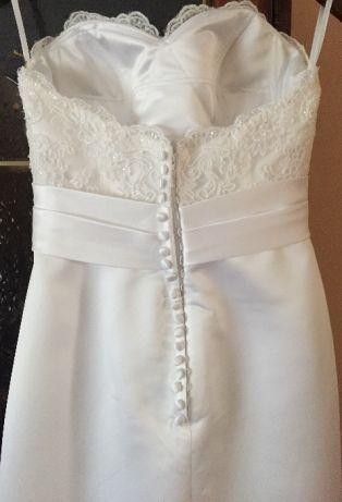 Suknię charakteryzuje piękna koronkowa góra oraz zmysłowy tył (zapinana na zamek, którego nie widać dzięki ozdobnym guzikom).