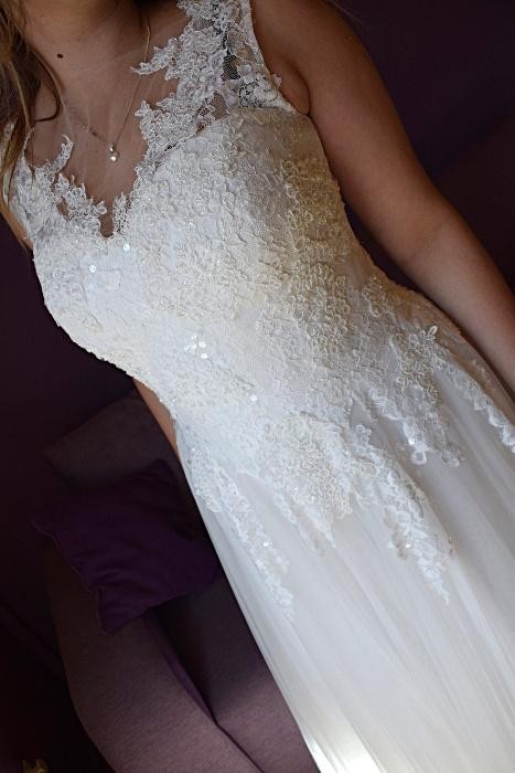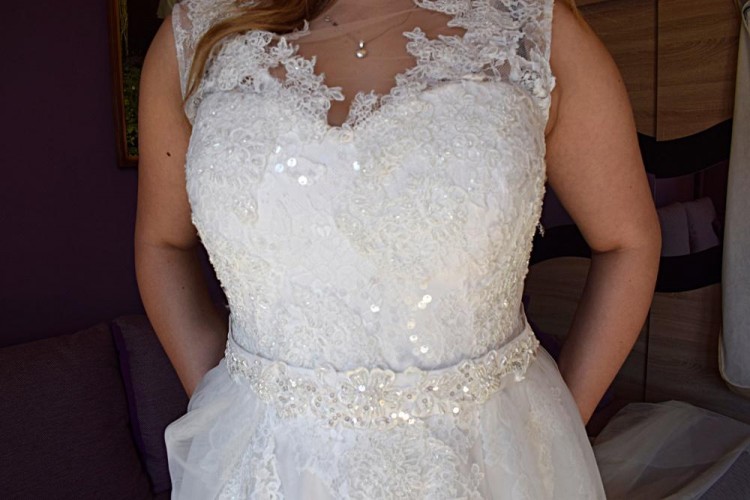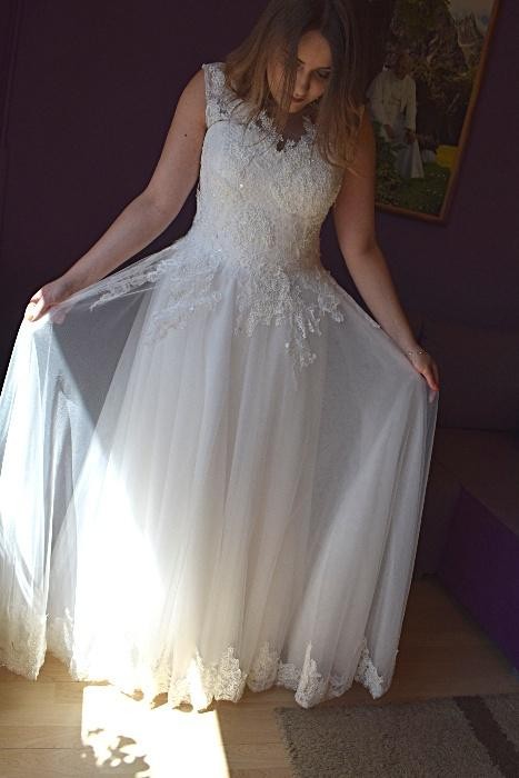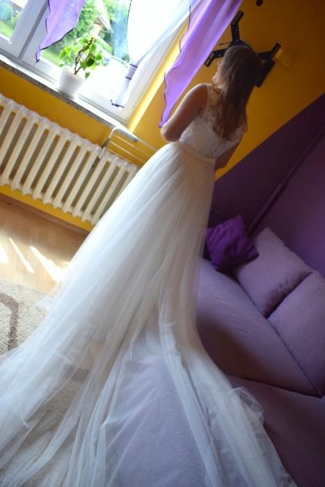 Posiadam na sprzedaż zjawiskowa suknie ślubną. Nigdy nie była używana jedynie ubrana na poczet tego ogłoszenia. Sukienka posiada wbudowany gorset który oklejony jest bazowa koronka i aplikacjami z gipiury oraz drobnymi cekinami. Gorset jest wiązany dzięki czemu dopasuje się do większości figur z tyłu znajduje się również zamek ekspresowy a tył wykończony jest guziczki. Do sukni ślubnej dodatkowo jest dołączony obłedny 2-metrowy tren odpinany na paseczku :O Do sukienki dołączę dodatki ślubne między innymi opaskę i ozdobę do włosów z perełek.